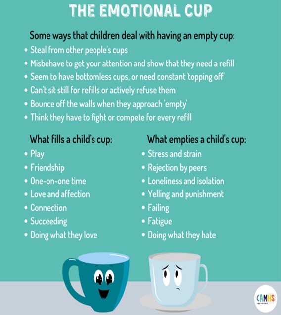 Many of our everyday interactions can help fill a child’s “emotional cup” whether it’s greeting them warmly, sharing a funny story, giving them space to talk about their interests, recognising their efforts or showing empathy for their feelings. The idea of an emotional cup is a useful way to help children understand why it’s important to notice their emotions, reach out when they feel “empty,” and learn what they can do to keep their cup full.